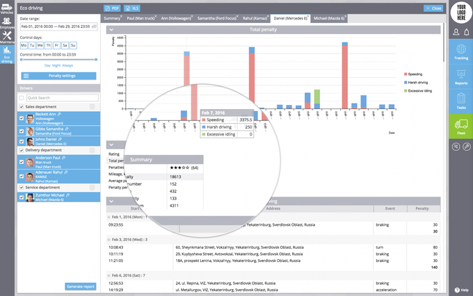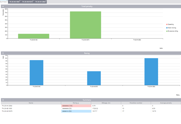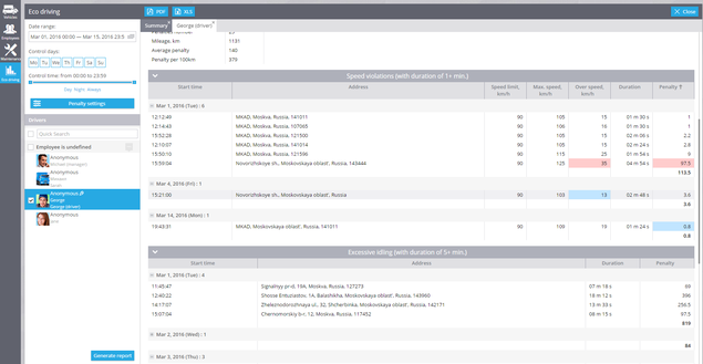 After you have set all the settings, you can generate a report of an employee or a group of objects for detailed information. Graphics visually display the total penalty and mark objects’ speeding, idling and harsh driving with special colours.