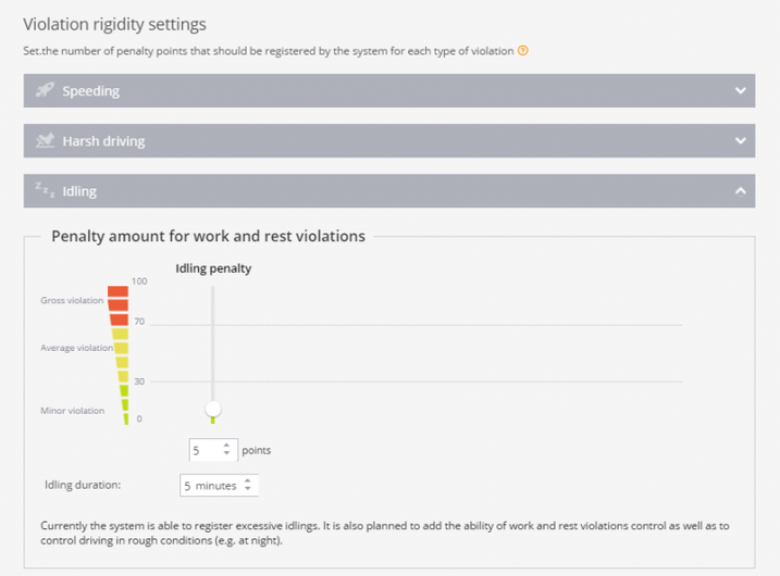Navixy is able to register vehicles’ excessive idling. Choose the idling duration value as a starting mark and specify how many penalty points you want to assign.