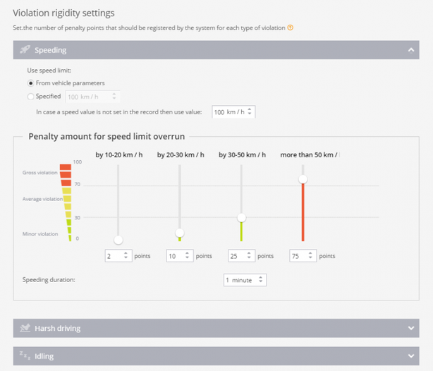 There are three main types of violations: Speeding, Harsh driving and Idling. Navixy obtains the data of a committed violation from a vehicle GPS tracker and makes it visual to analyze. Each type of violation has its own set of penalty points which are taken into account by the system for its further rating compilation.