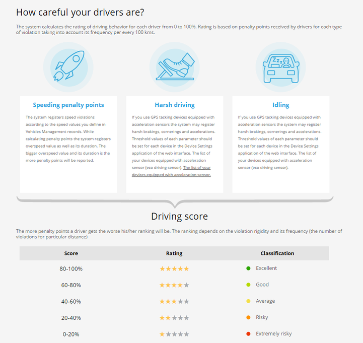 This week, we have released a new function – creative and intelligent Eco Driving. The indispensable solution for fleet management and vehicles smart control in general. Now, tracking your vehicles, you can evaluate the driver behavior according to different factors like speeding, harsh driving and idling. The new application will make your business more productive and reduce the costs. Specifically, it allows you to reduce the costs for penalties, fuel, auto repairs and increase employees safety by reducing car accidents. Well, get down to the details.